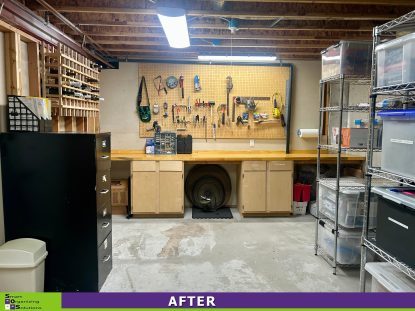 Once the sorting was complete, we implemented a smart home organizing system that maximized the shelving and workbench space. The result is a tidy, functional basement where everything has a place. Not only is the storage room easier to use, but having an organized workshop and storage area also improves the flow and calm throughout the rest of the home.